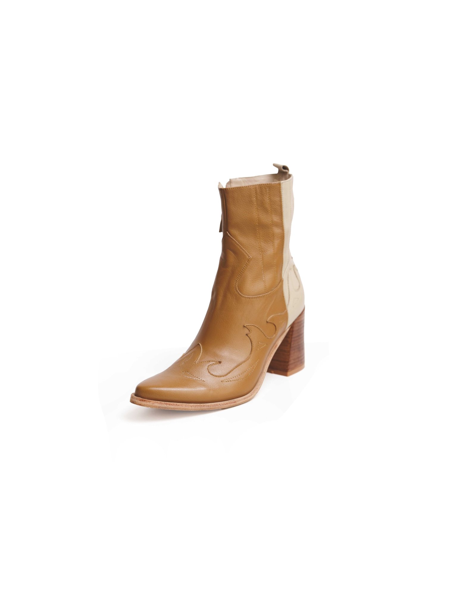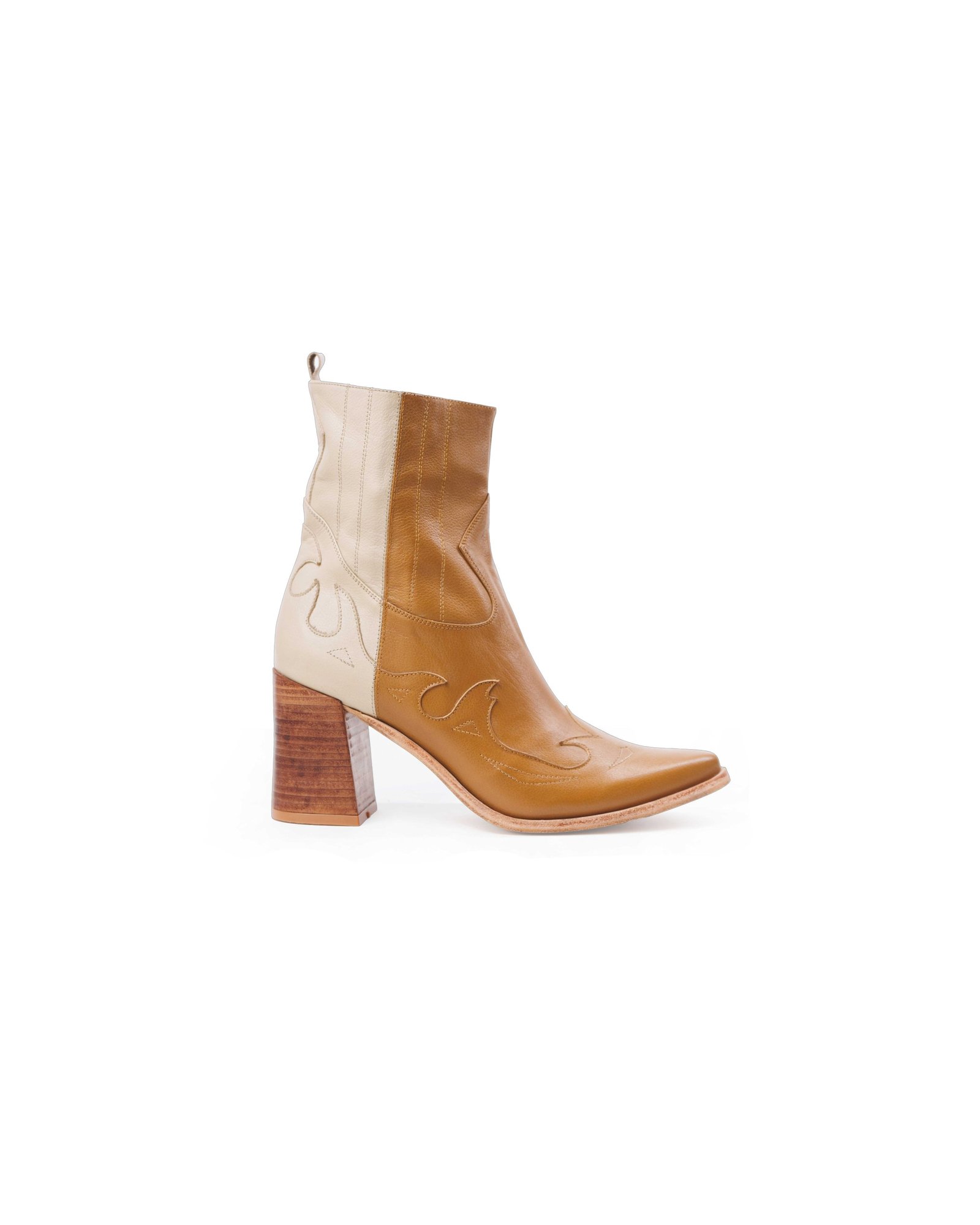 El Botín Majo bicolor es una propuesta de estilo único, elaborado artesanalmente en Perú con cuero minifloter en tonos natural e ivory. Su diseño de contraste aporta sofisticación y versatilidad, convirtiéndolo en una pieza clave para looks urbanos, casuales o elegantes.